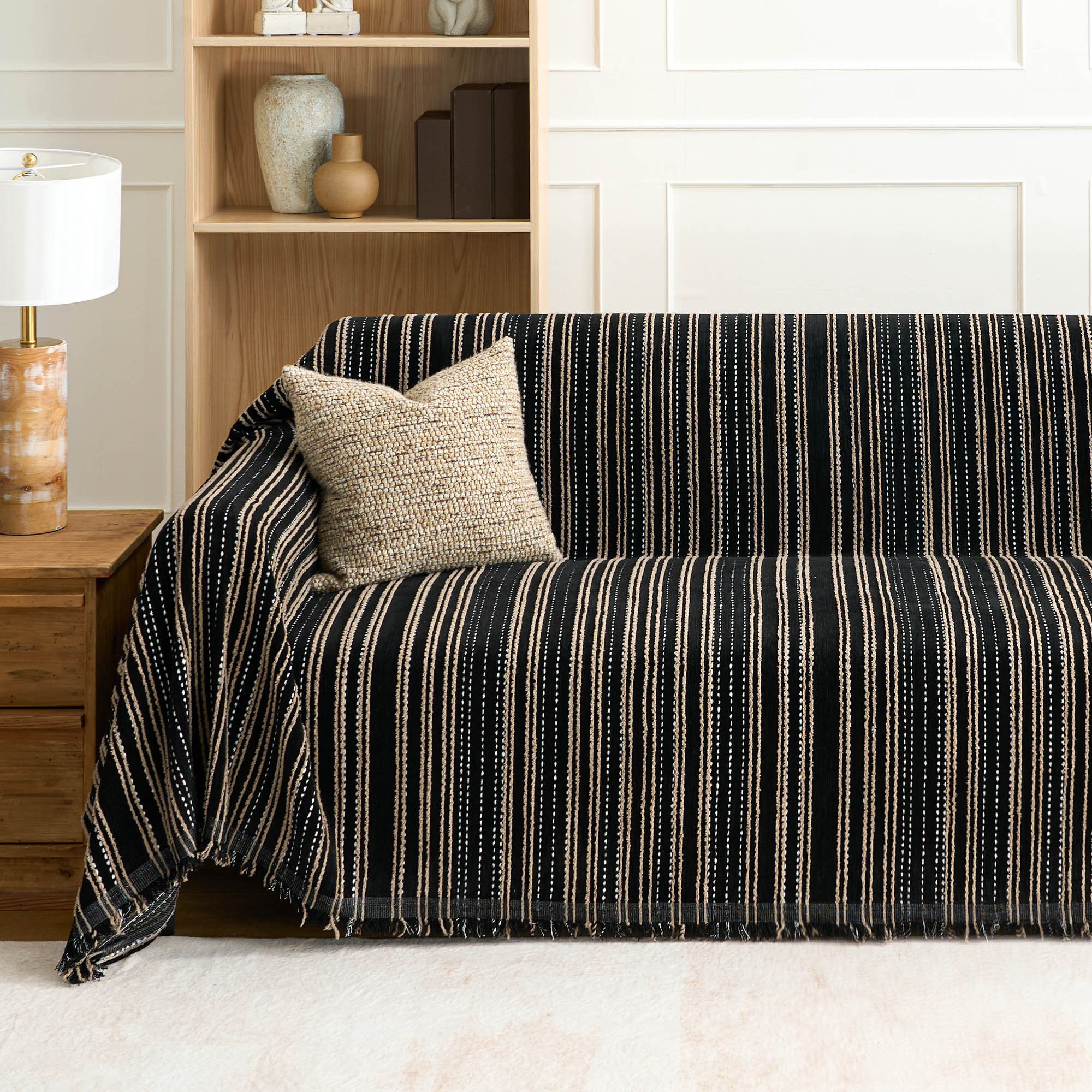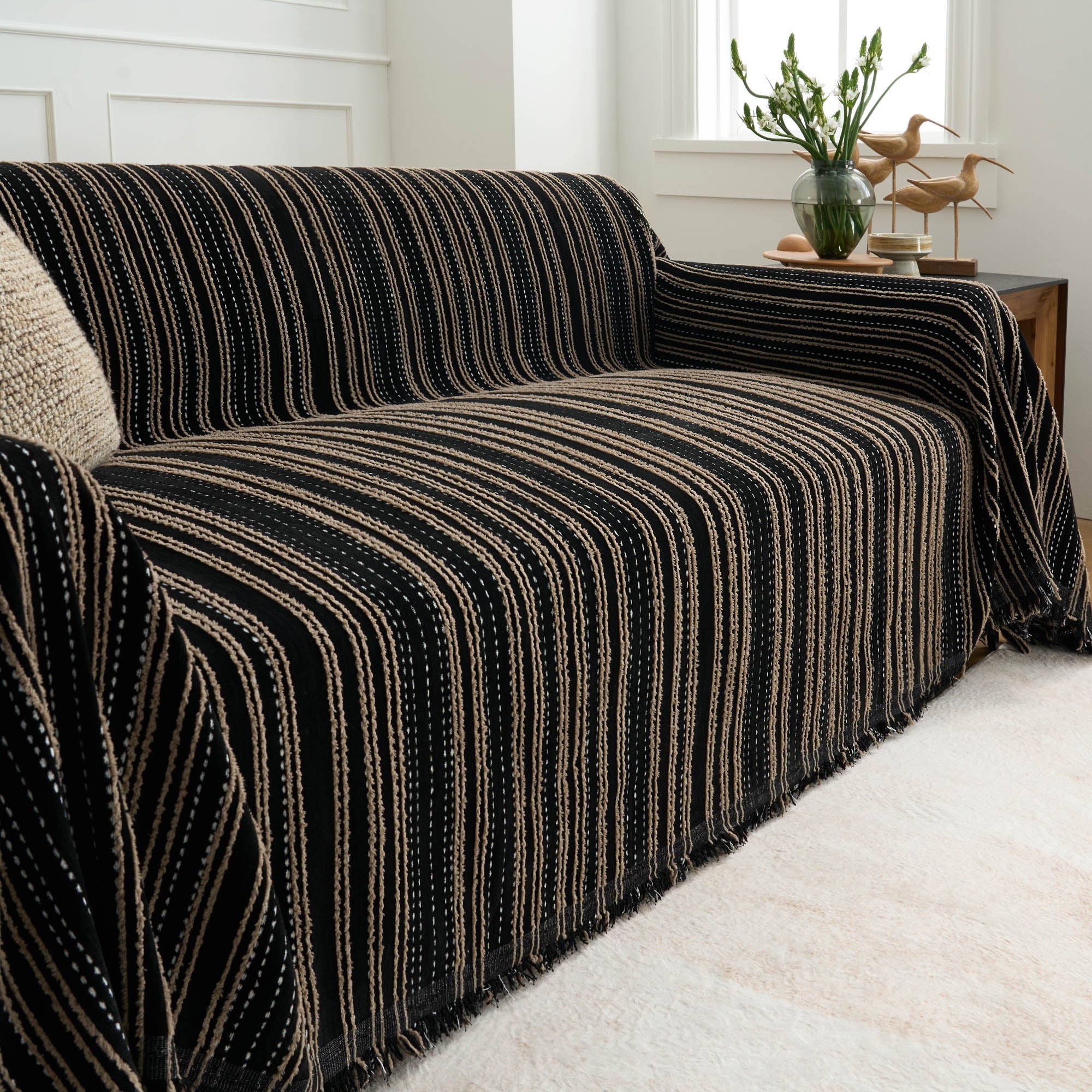 Dodaj odrobinę ponadczasowej elegancji do swojego salonu dzięki temu pokrowcowi na sofę w paski. Ten elegancki, monochromatyczny wzór w paski z łatwością podkreśli atmosferę Twojego pokoju dzięki klasycznemu i stylowemu wyglądowi. Teksturowana tkanina zapewnia przytulność i zachęcającą atmosferę, dzięki czemu idealnie nadaje się do codziennego relaksu, a jednocześnie stanowi warstwę ochronną dla Twoich mebli. Niezależnie od tego, czy zależy Ci na minimalistycznym, czy wyrazistym stylu, ten pokrowiec z łatwością dopasuje się do różnych stylów aranżacji.