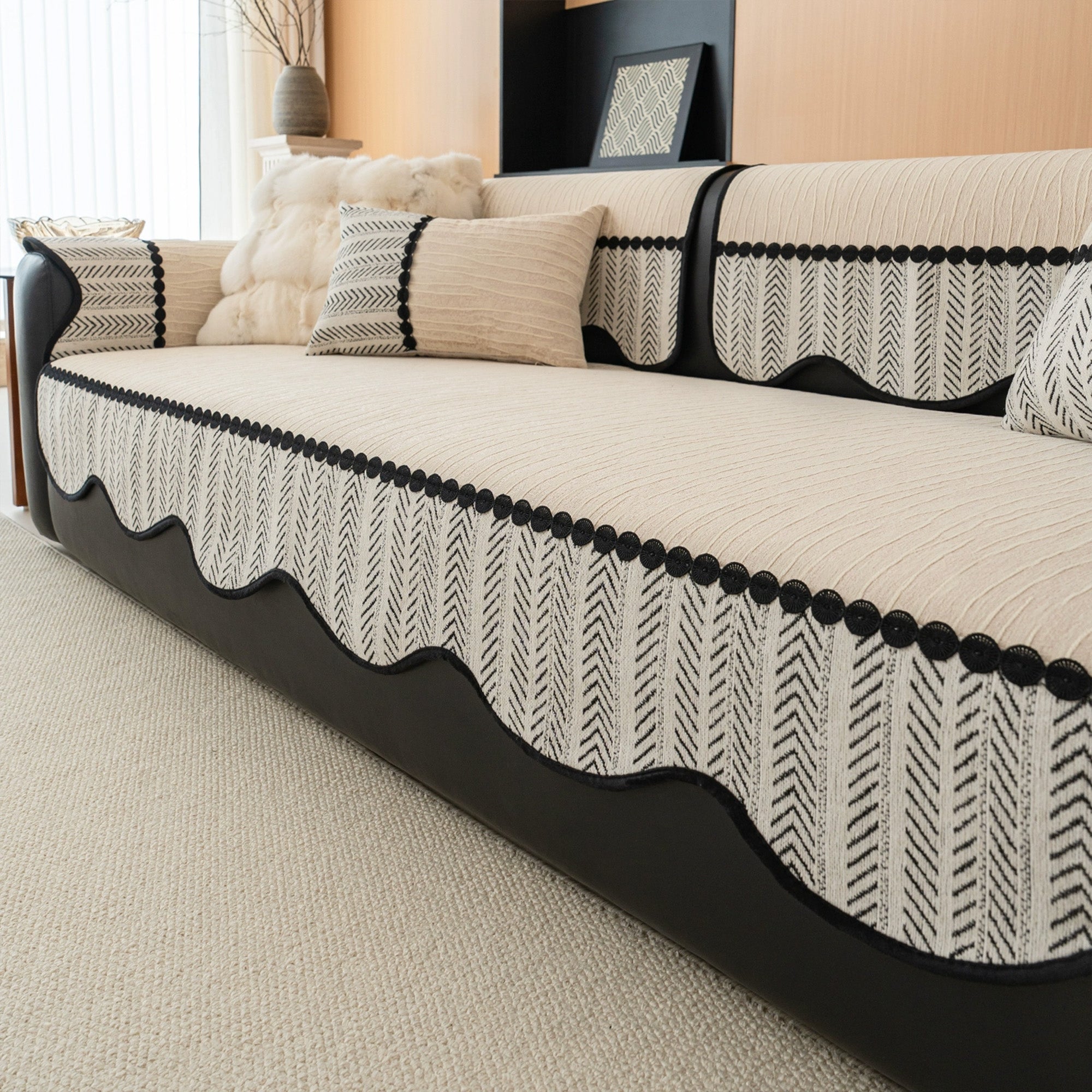 Odśwież wystrój swojego domu dzięki antypoślizgowemu pokrowcowi na sofę Geometric Charm Jacquard, który zachwyca efektownym wzorem inspirowanym jodełką, obramowanym wyrazistą czarną lamówką. Jego artystyczny wzór łączy ponadczasową elegancję z nowoczesnym charakterem, tworząc stylowy element centralny każdego salonu. Wykonany z wysokiej jakości tkaniny żakardowej, pokrowiec zapewnia trwałość i wygodę, a jednocześnie niezawodną funkcję antypoślizgową. Idealny do ochrony sofy przed codziennym zużyciem, sierścią zwierząt czy zalaniem, idealnie wpasowuje się zarówno w nowoczesne, jak i klasyczne wnętrza.