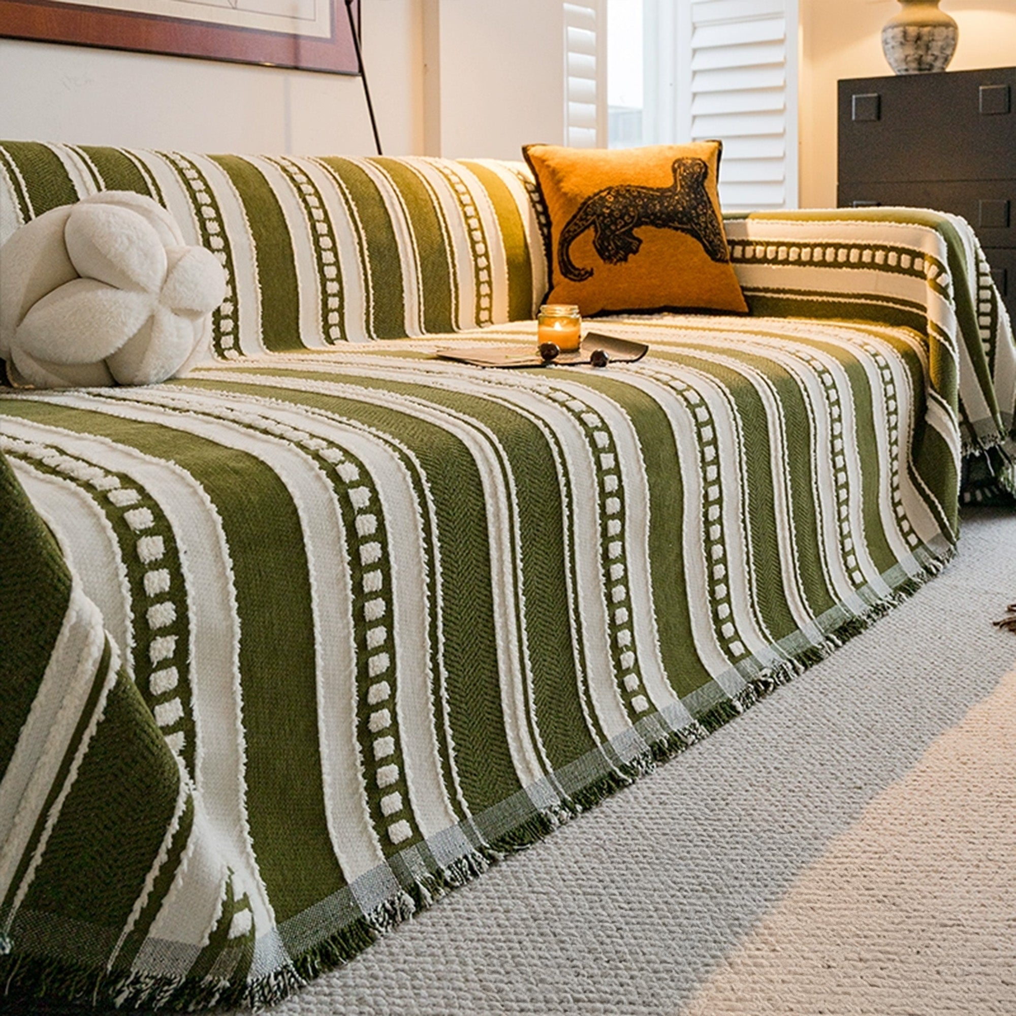 Przywołując ciepło pustynnej ziemi i śmiałość plemiennego rytmu, pokrowiec na sofę Savanna Rhythm Chenille oferuje bogaty, przyjemny w dotyku dodatek do każdego wnętrza. Jego naprzemienne tkane paski i wypukłe, kropkowane pasy inspirowane są rdzennym kunsztem tekstylnym, przeniesionym do nowoczesnych wnętrz dzięki luksusowym przędzom szenilowym i kontrastowym paletom barw. Wykończony miękkimi frędzlami, pokrowiec jest równie przytulny, co przyciąga wzrok – to uderzające połączenie komfortu i charakteru.