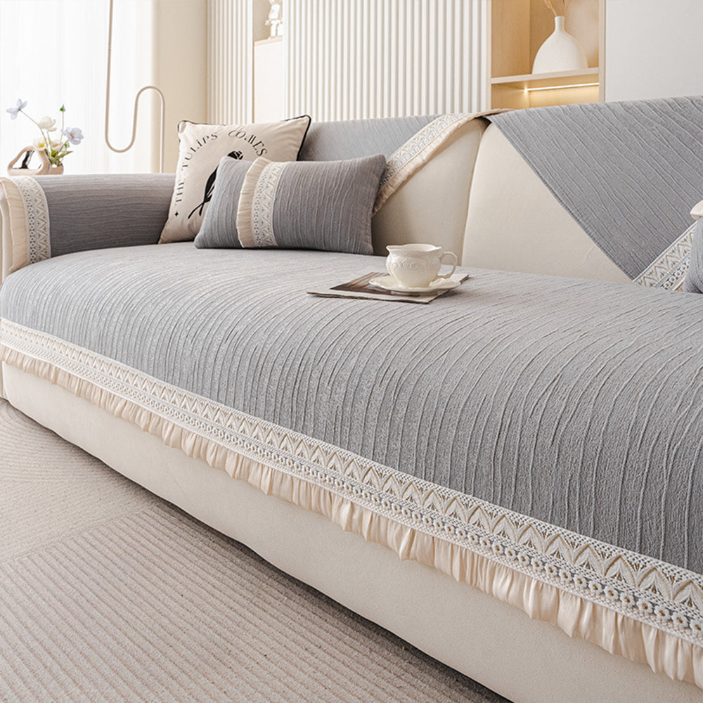 Ubierz swoją sofę w elegancki komfort dzięki naszemu eleganckiemu, koronkowemu, antypoślizgowemu pokrowcowi na sofę Chenille. Prążkowana powierzchnia z szenili jest miękka, a jednocześnie oddychająca, a bezpieczny, antypoślizgowy spód pomaga utrzymać każdy element na miejscu, zarówno na skórzanych, jak i materiałowych sofach. Delikatna koronka i miękkie, falbaniaste wykończenie dodają lekkiego, luksusowego akcentu, który wzbogaci każdy salon.
