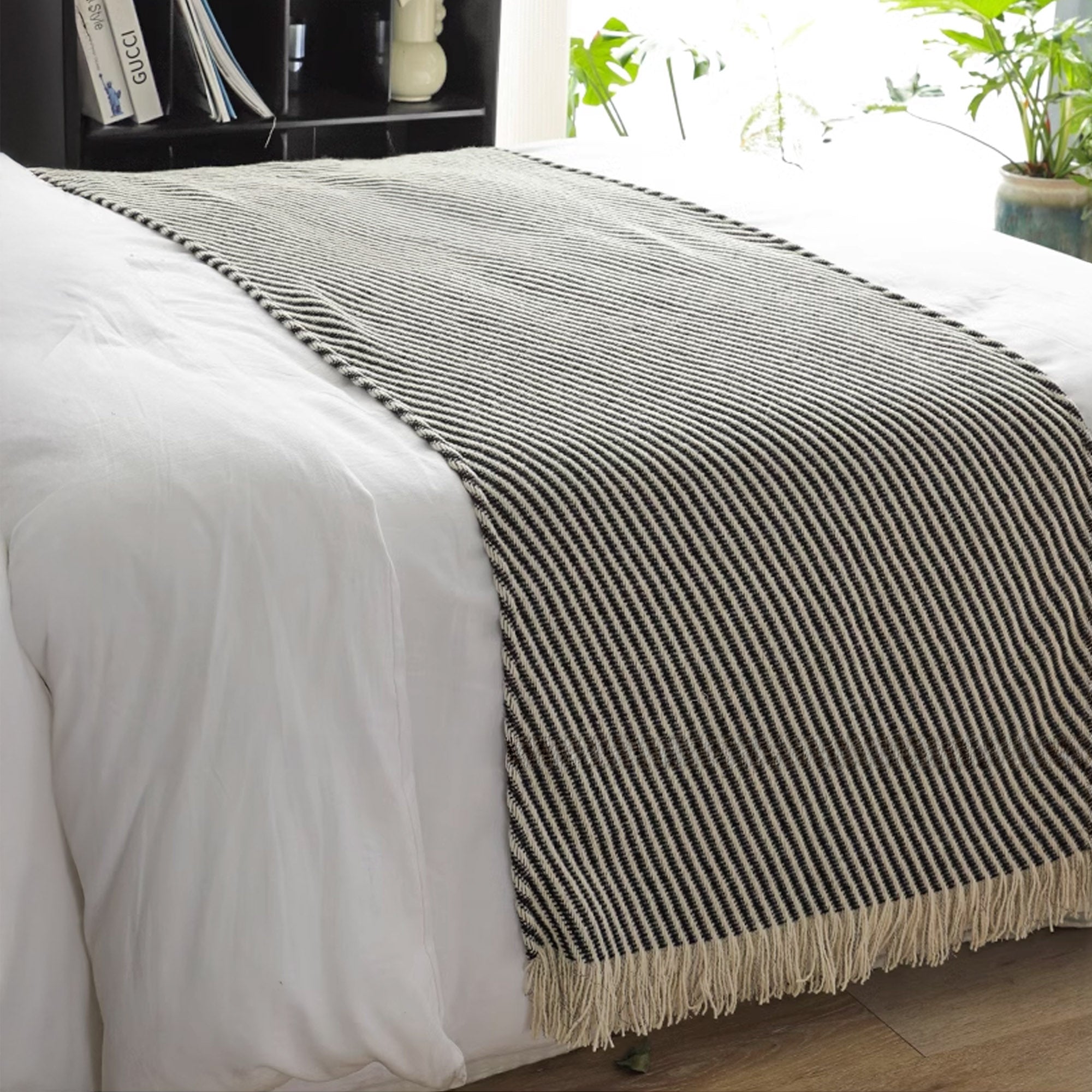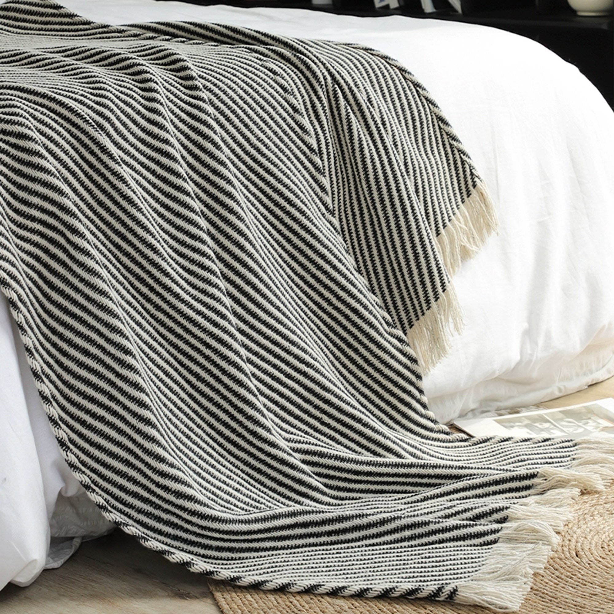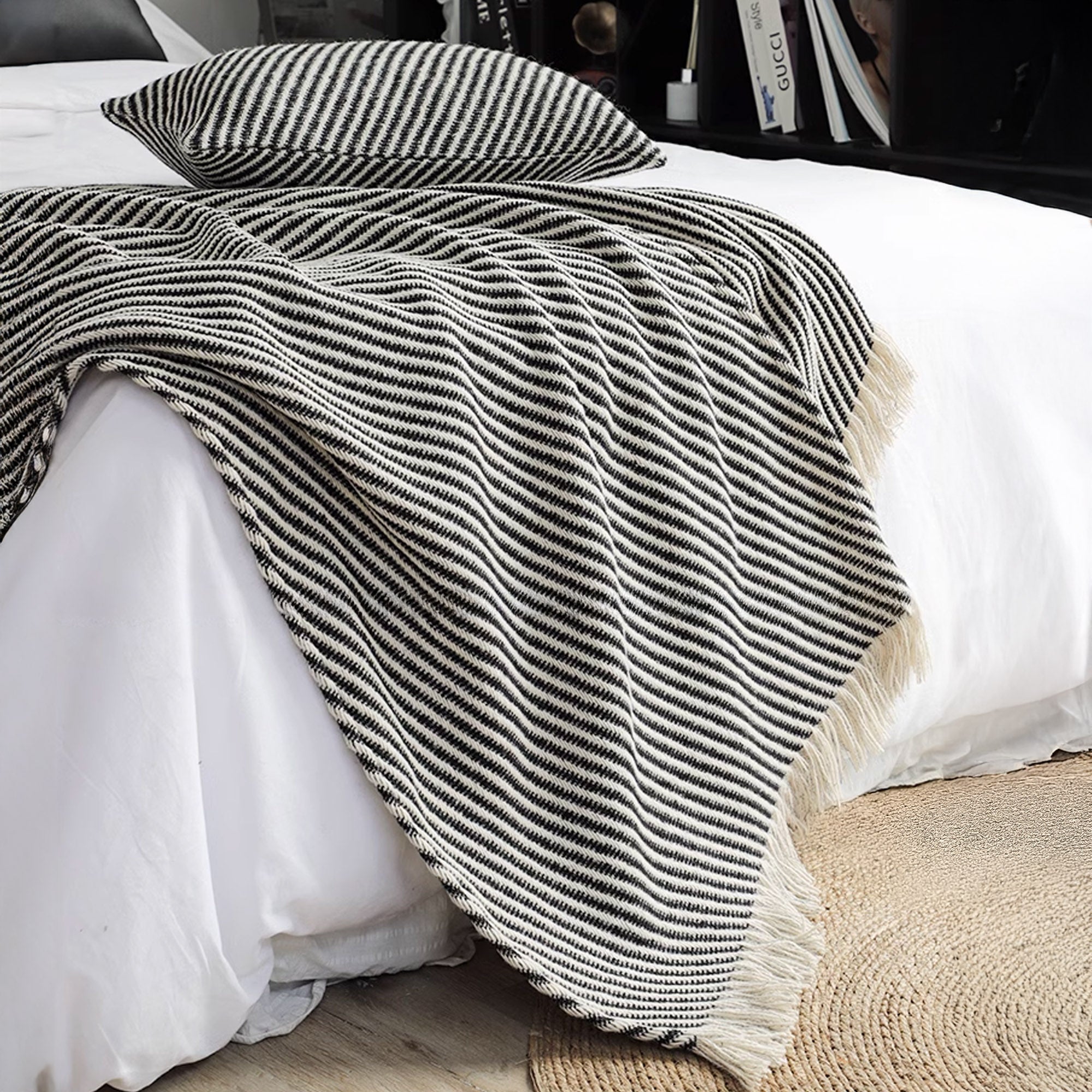 Nowoczesny koc dzianinowy w paski z frędzlami