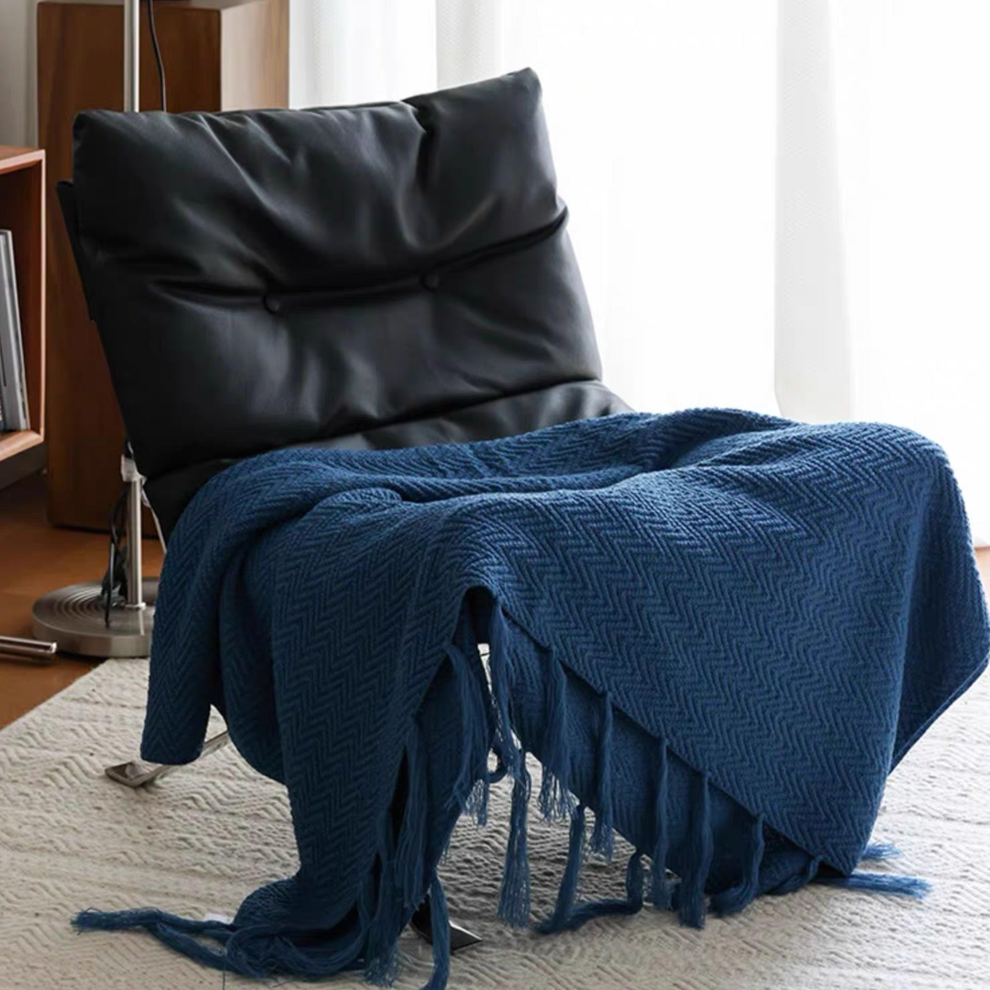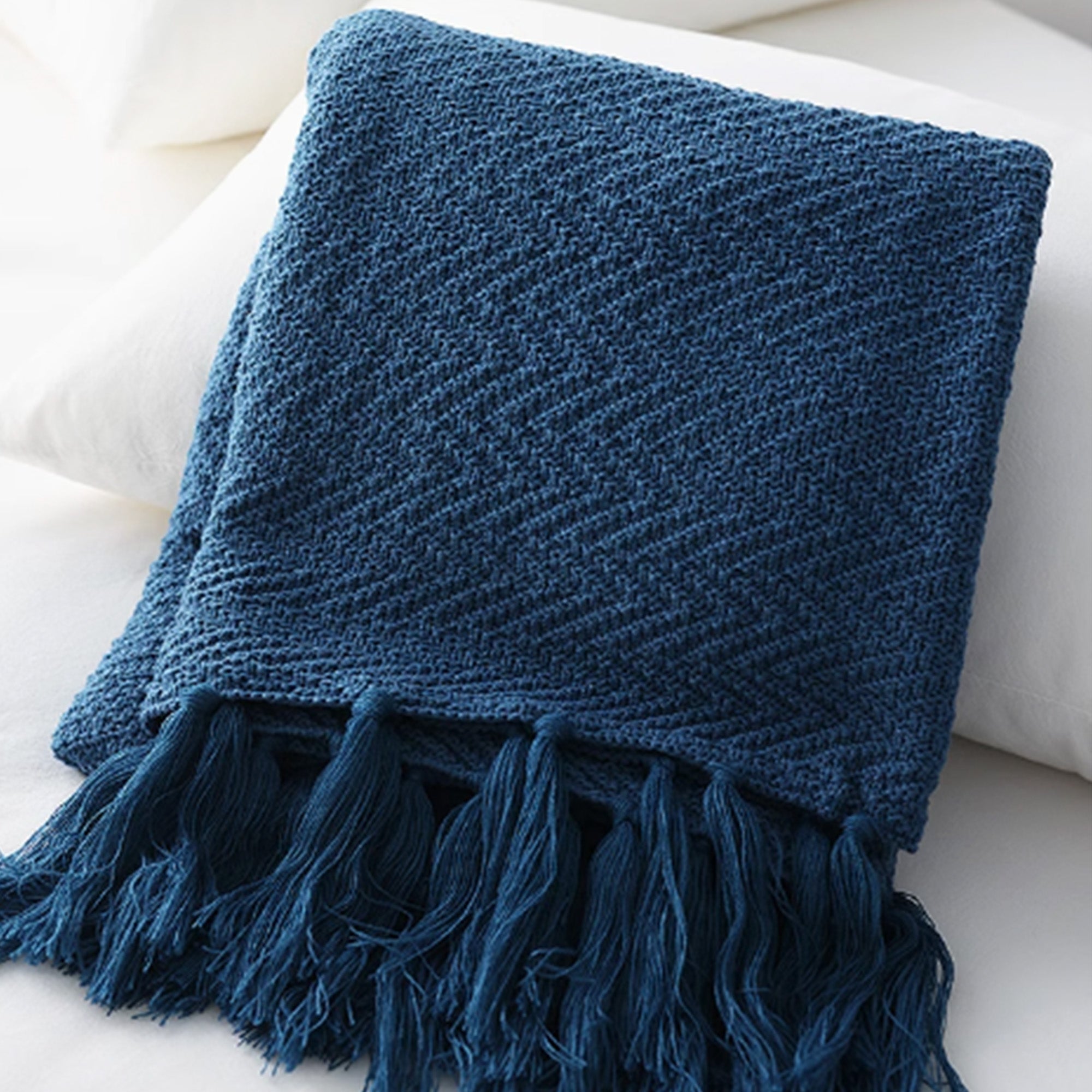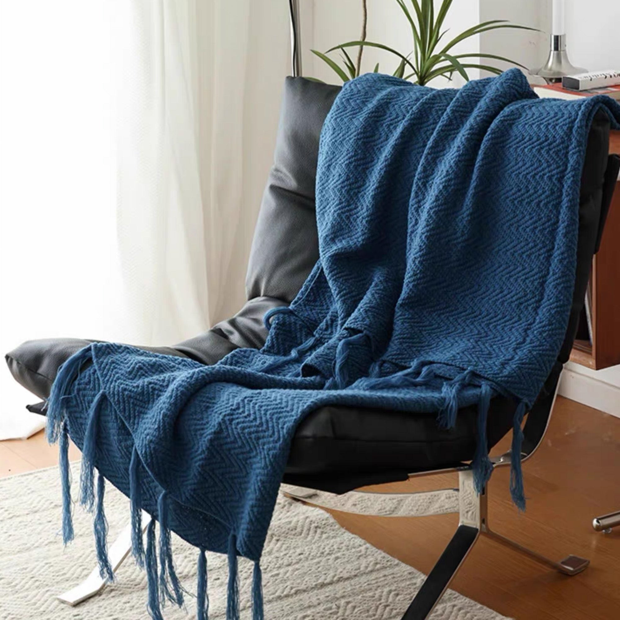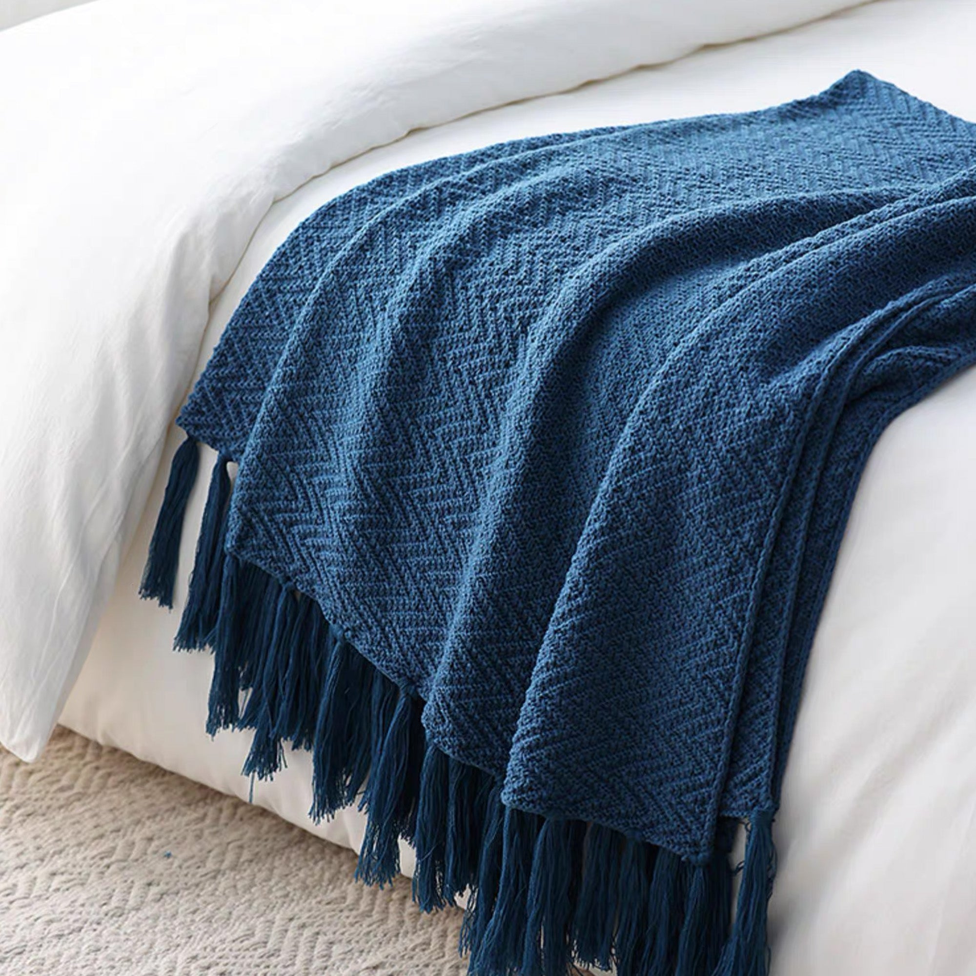 Rozkoszuj się ciepłem i elegancją skandynawskiego wzornictwa dzięki naszemu nordyckiemu pledowi dzianinowemu. Ten bogaty, ciemnoniebieski koc o fakturze i klasycznym wzorze w jodełkę zdobią długie, zwiewne frędzle, które dodadzą przytulności i stylu każdemu wnętrzu. Idealny do otulenia się w chłodne wieczory lub jako piękny element dekoracyjny sofy, łóżka czy kącika do czytania.