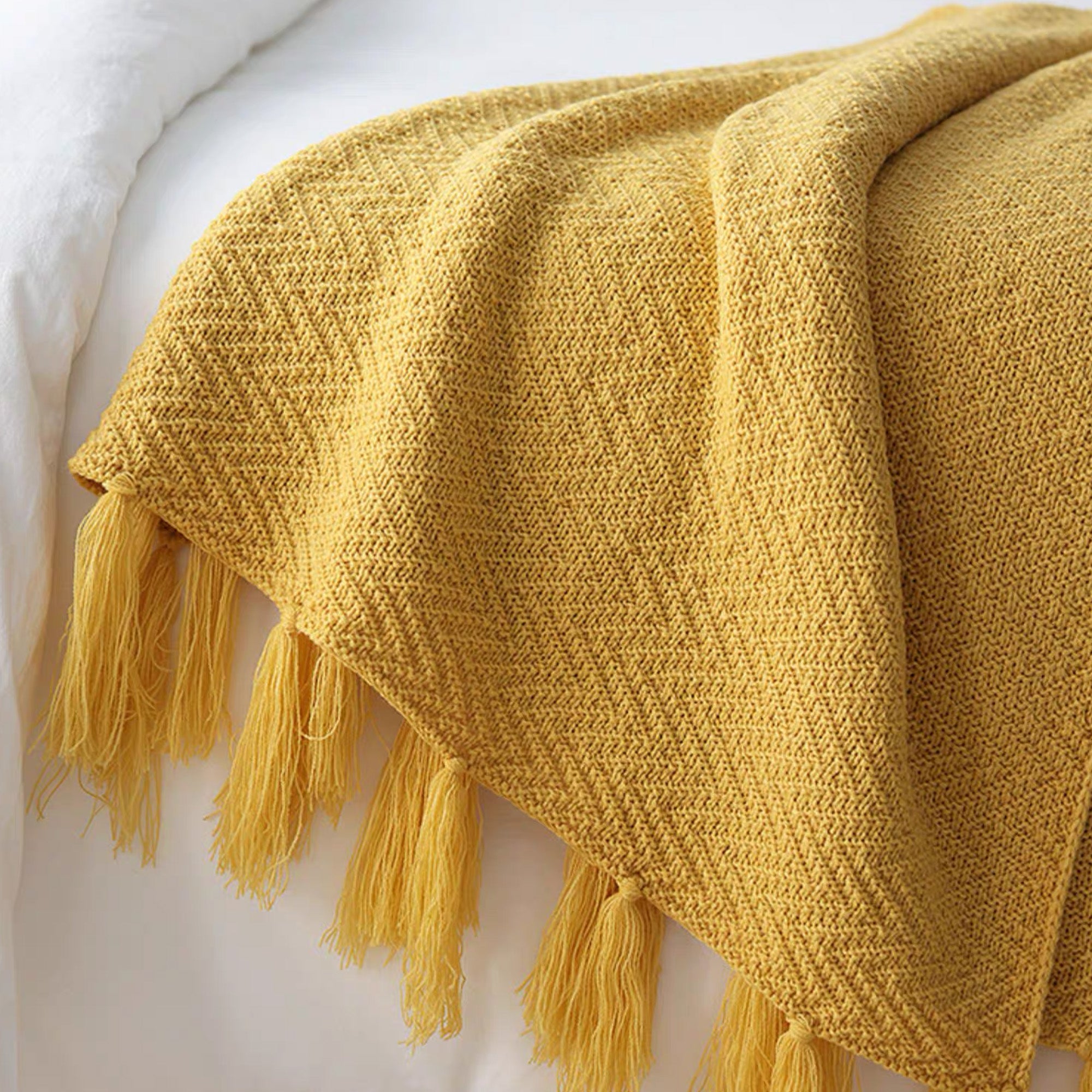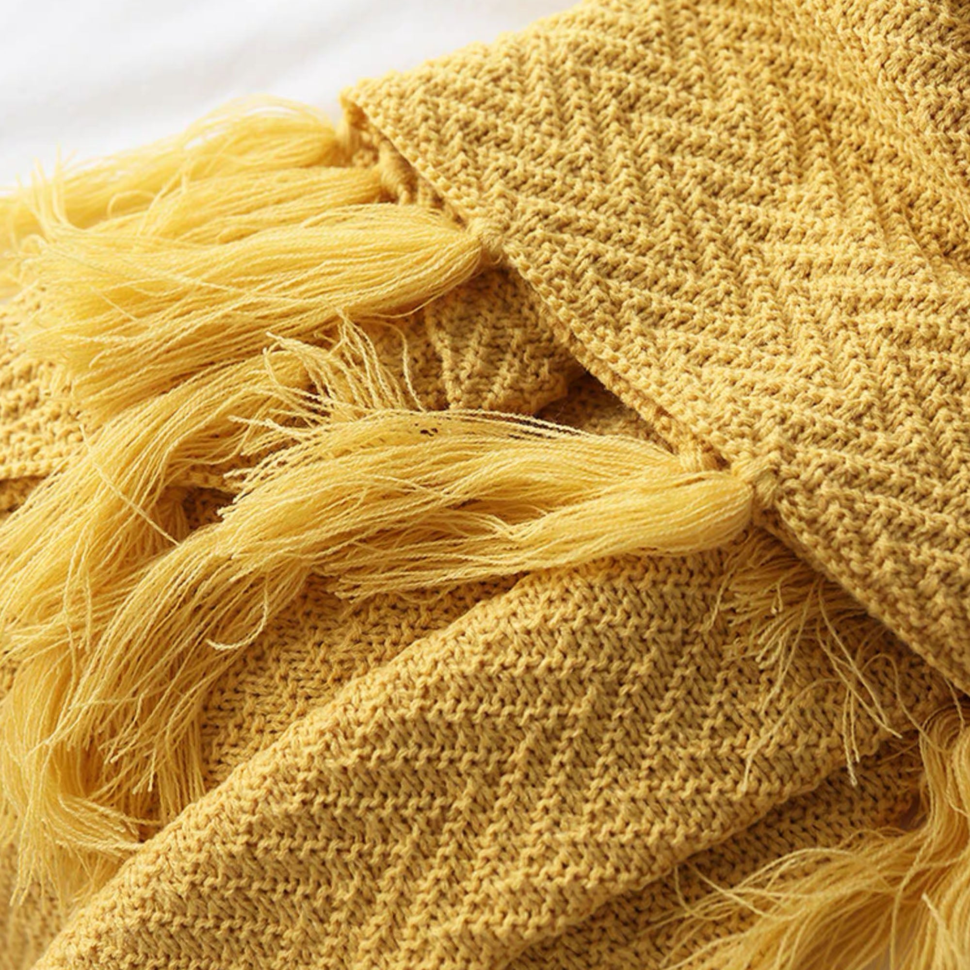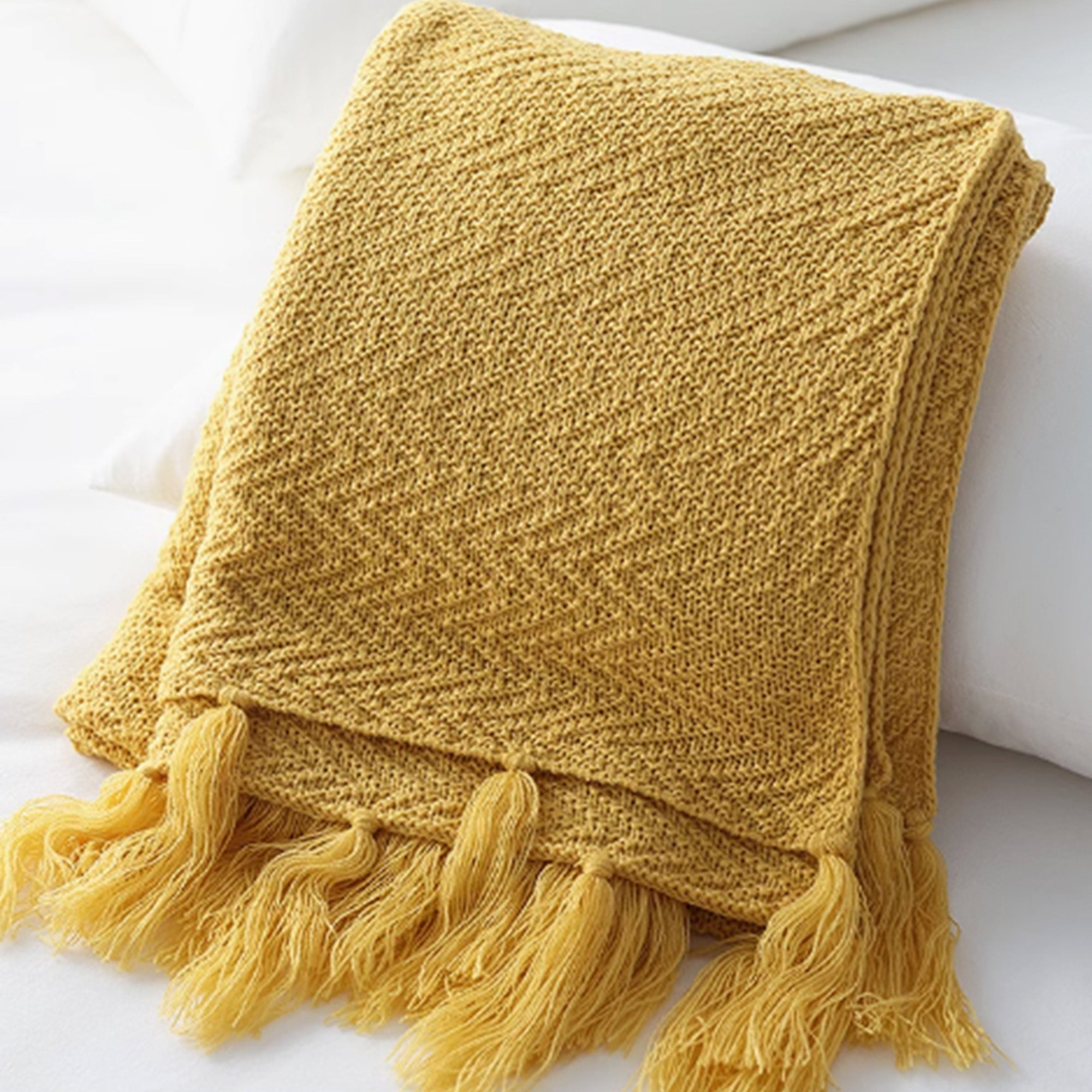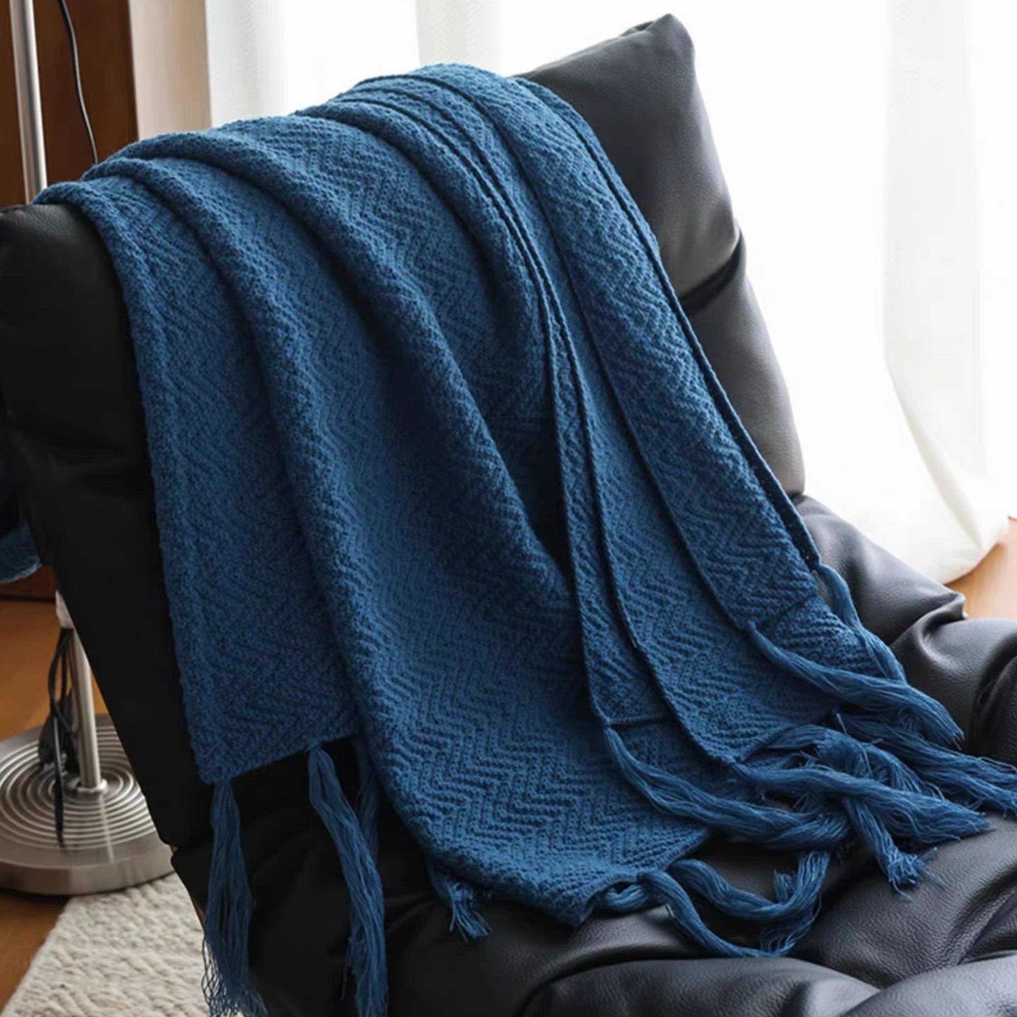 Rozkoszuj się ciepłem i elegancją skandynawskiego wzornictwa dzięki naszemu nordyckiemu pledowi dzianinowemu. Ten bogaty, ciemnoniebieski koc o fakturze i klasycznym wzorze w jodełkę zdobią długie, zwiewne frędzle, które dodadzą przytulności i stylu każdemu wnętrzu. Idealny do otulenia się w chłodne wieczory lub jako piękny element dekoracyjny sofy, łóżka czy kącika do czytania.