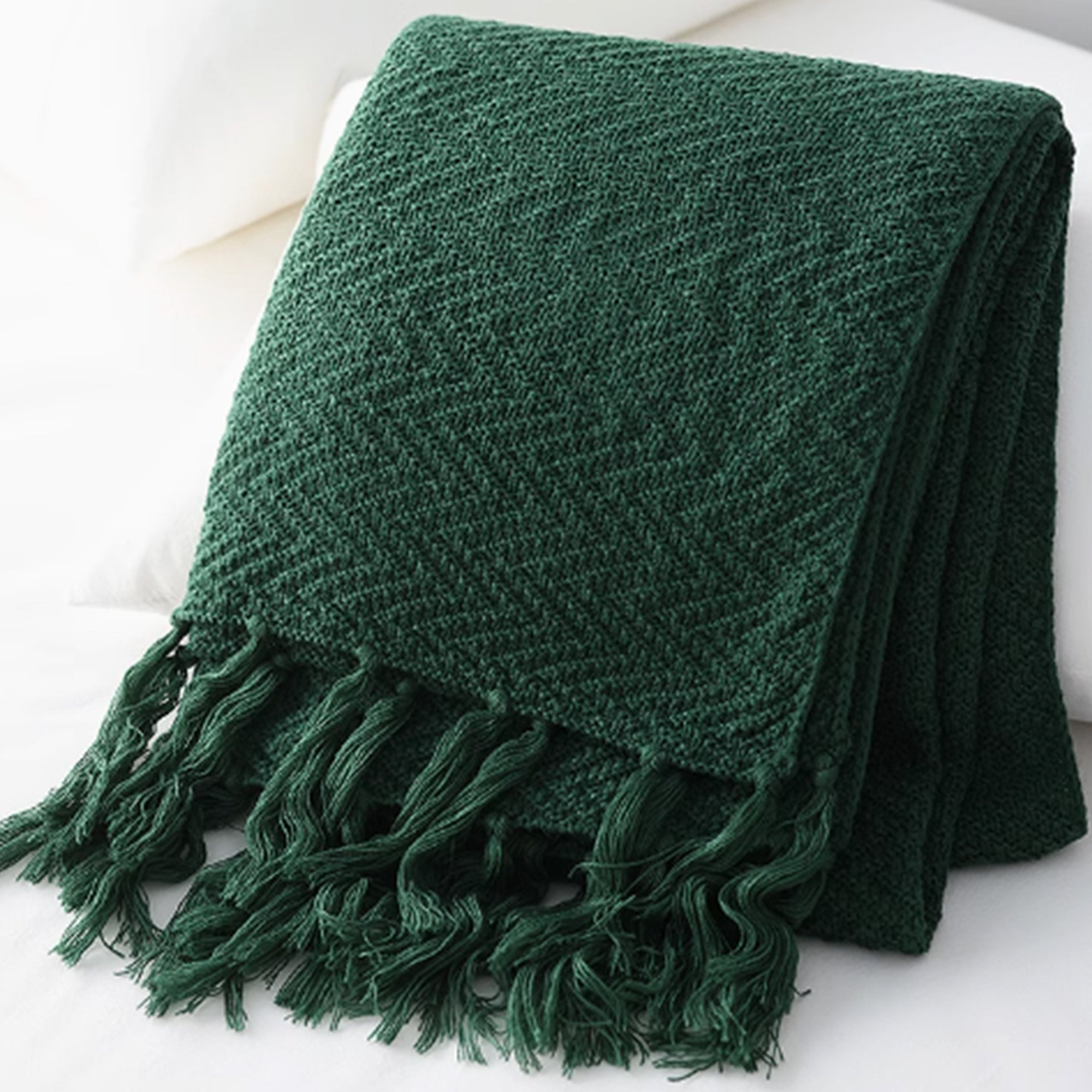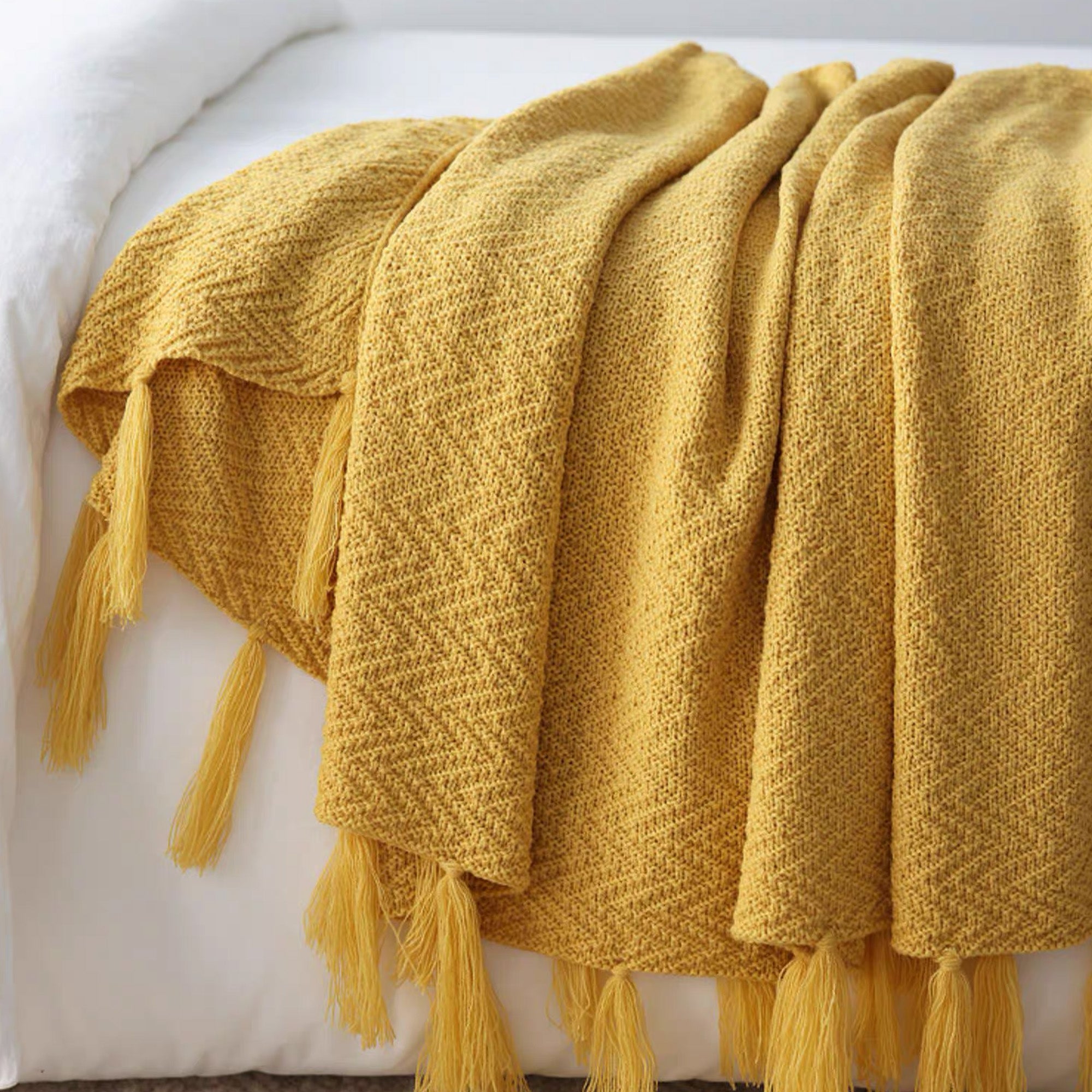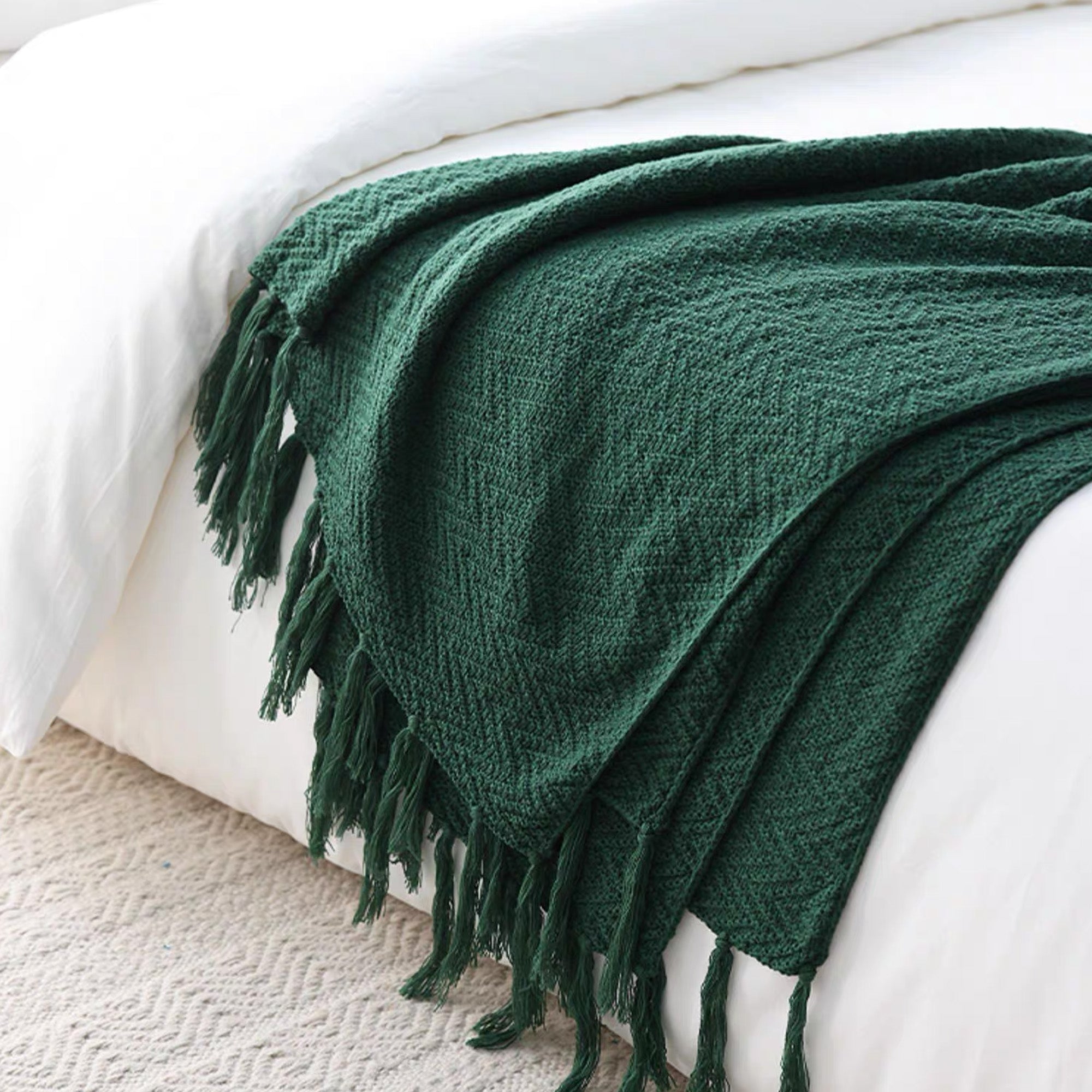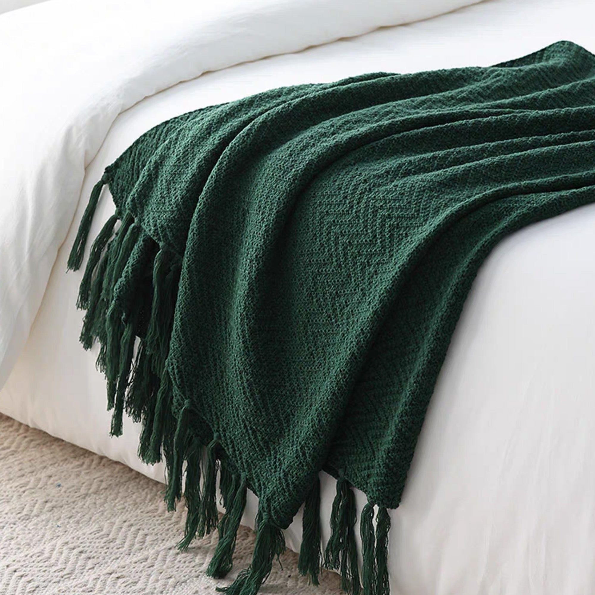 Rozkoszuj się ciepłem i elegancją skandynawskiego wzornictwa dzięki naszemu nordyckiemu pledowi dzianinowemu. Ten bogaty, ciemnoniebieski koc o fakturze i klasycznym wzorze w jodełkę zdobią długie, zwiewne frędzle, które dodadzą przytulności i stylu każdemu wnętrzu. Idealny do otulenia się w chłodne wieczory lub jako piękny element dekoracyjny sofy, łóżka czy kącika do czytania.
