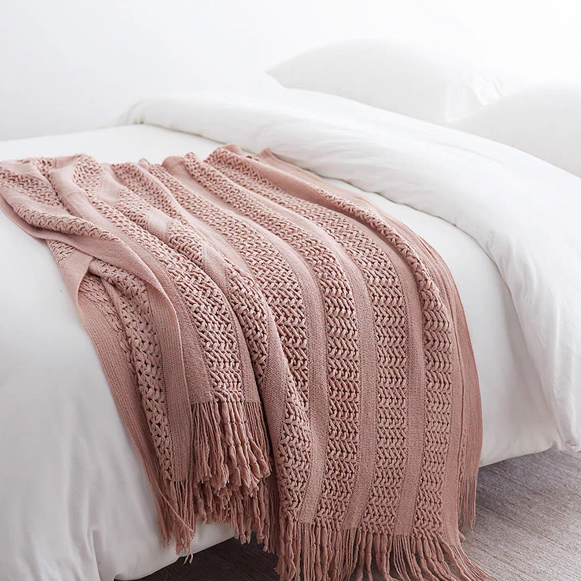 Dodaj odrobinę rustykalnej elegancji do swojej przestrzeni z naszym pledem z dzianiny Open Weave. Wykonany z miękkiej, oddychającej przędzy, ten pled charakteryzuje się unikalnym ażurowym splotem, który doda faktury i uroku każdemu wnętrzu. Ręcznie wiązane frędzle dodają mu boho charakteru, dzięki czemu idealnie sprawdzi się jako dodatek do sofy, łóżka lub ulubionego fotela.