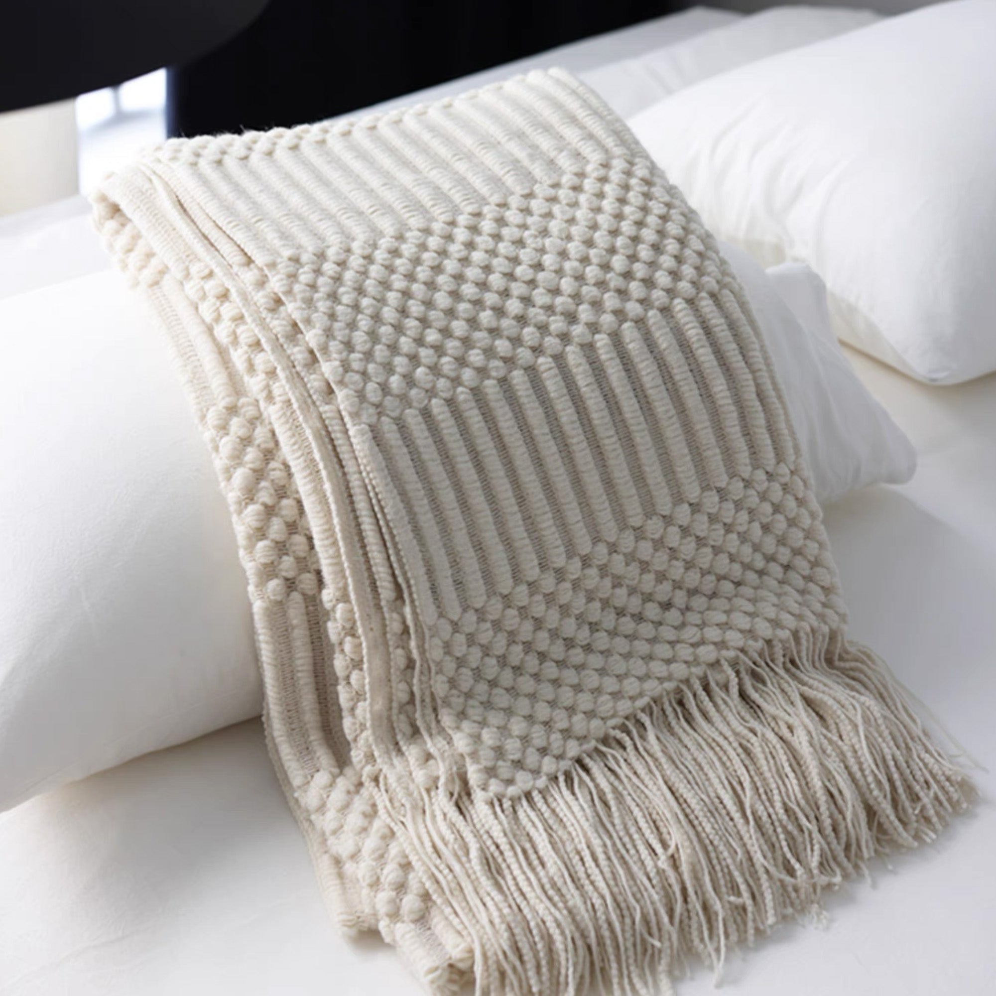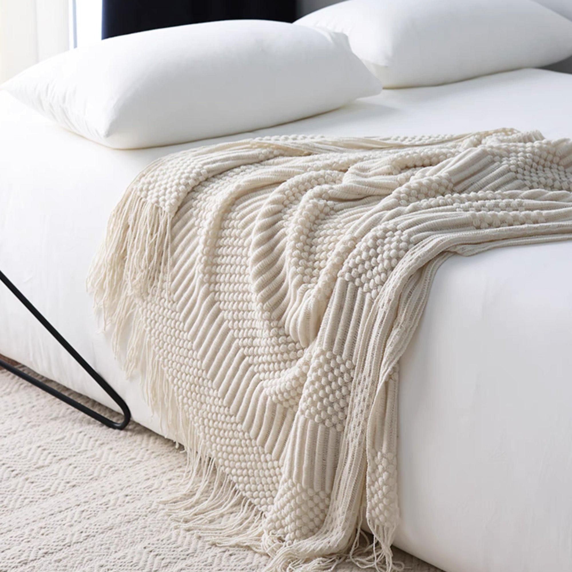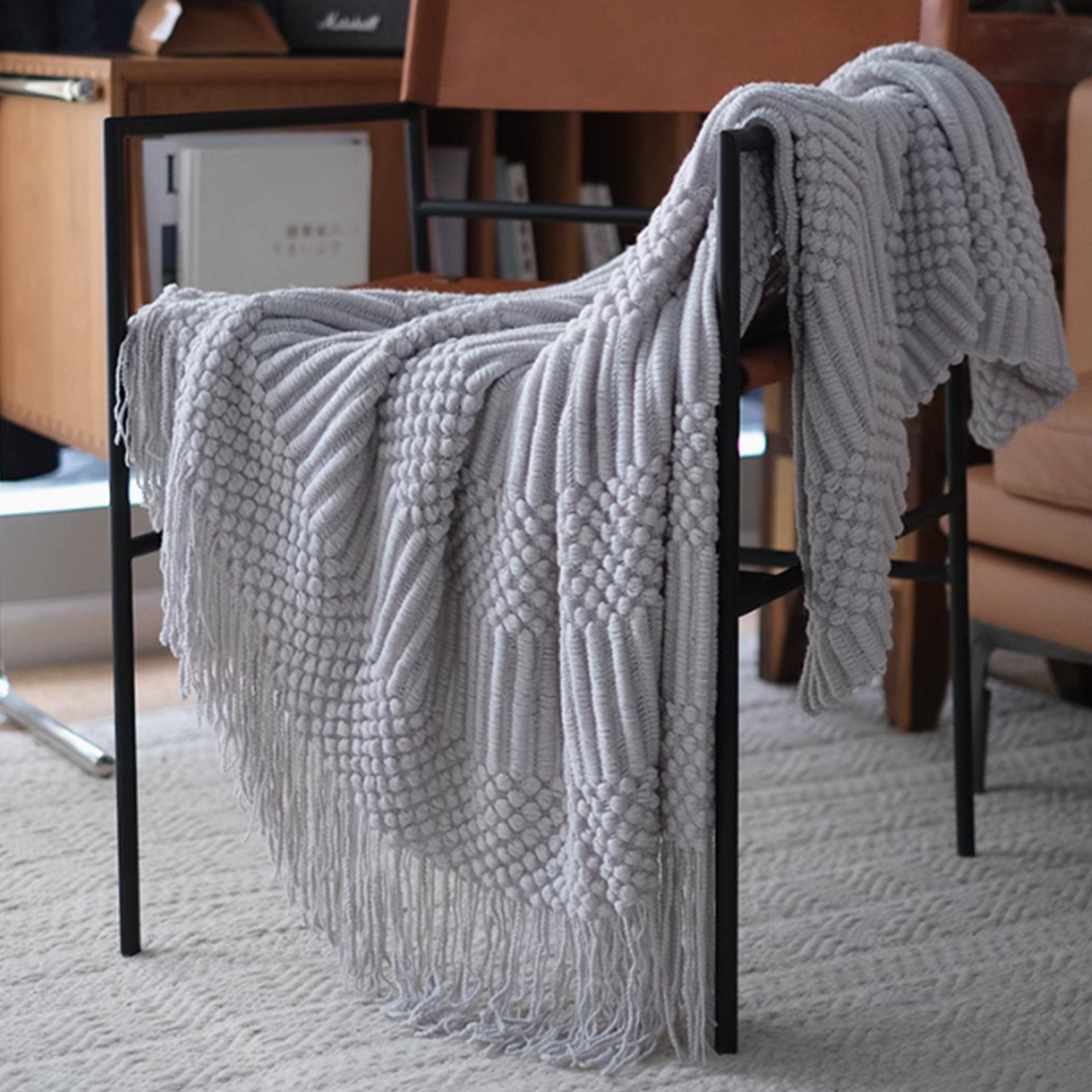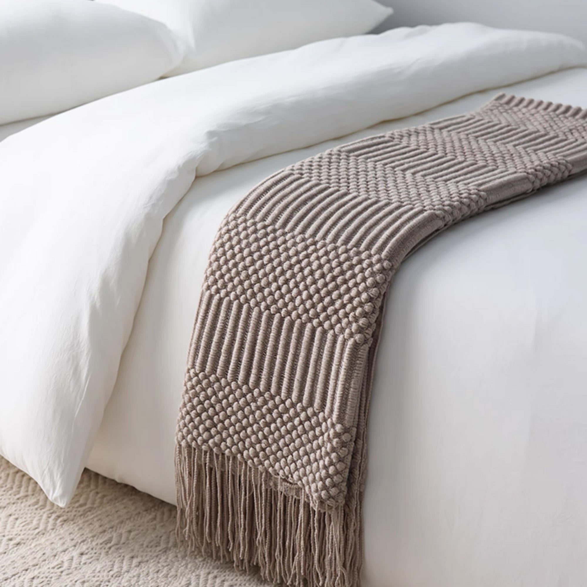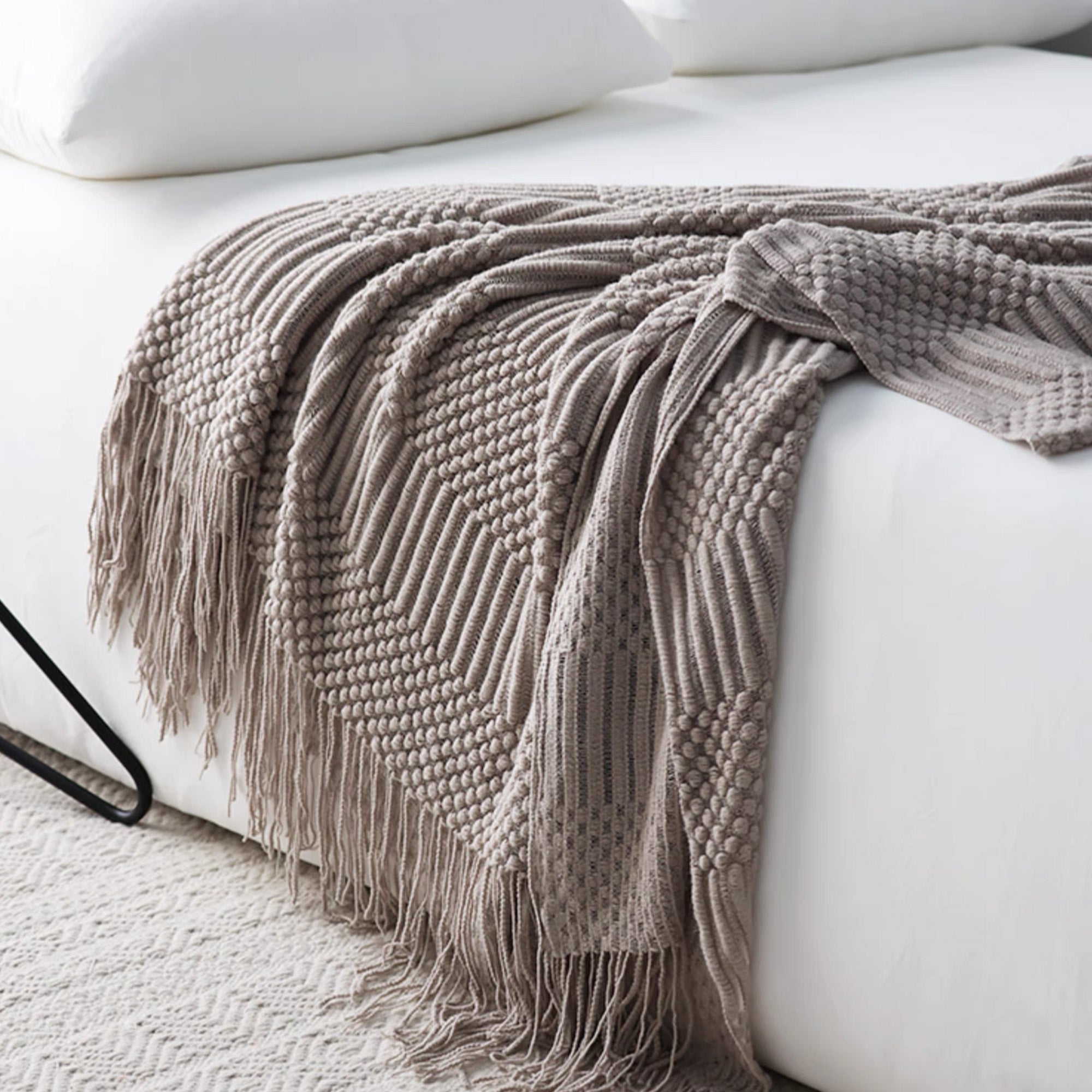 Dodaj odrobinę boho uroku do swojej przestrzeni dzięki naszemu narzutowi z frędzlami. Ten przytulny koc, wykonany z misternego, geometrycznego splotu o bogatym, teksturowanym wykończeniu, idealnie nadaje się do otulenia lub narzucenia na ulubiony fotel, tworząc stylowy akcent. Delikatne frędzle na brzegach podkreślają jego swobodną elegancję, dzięki czemu idealnie nadaje się do stworzenia ciepłej, przytulnej atmosfery w każdym pomieszczeniu.
