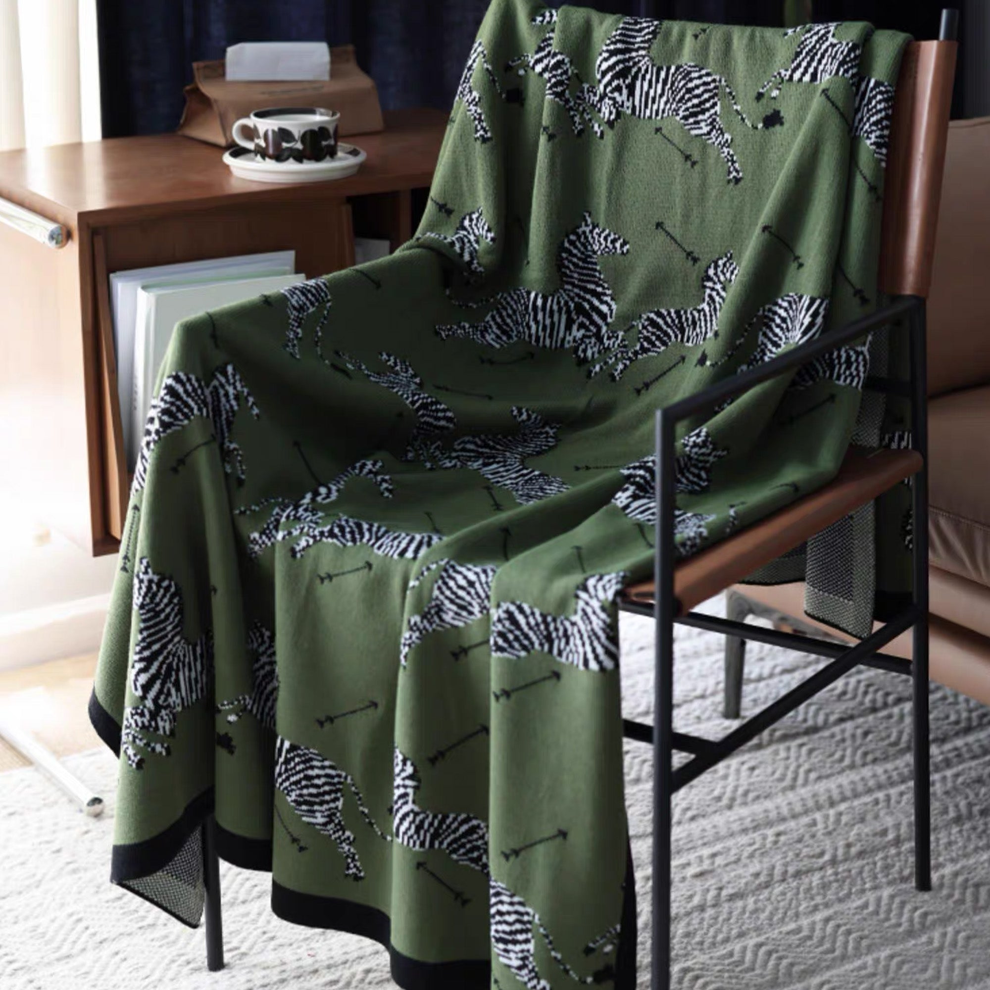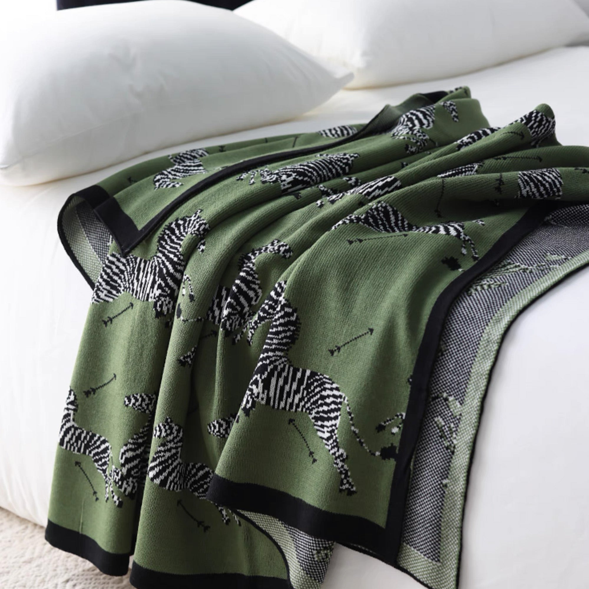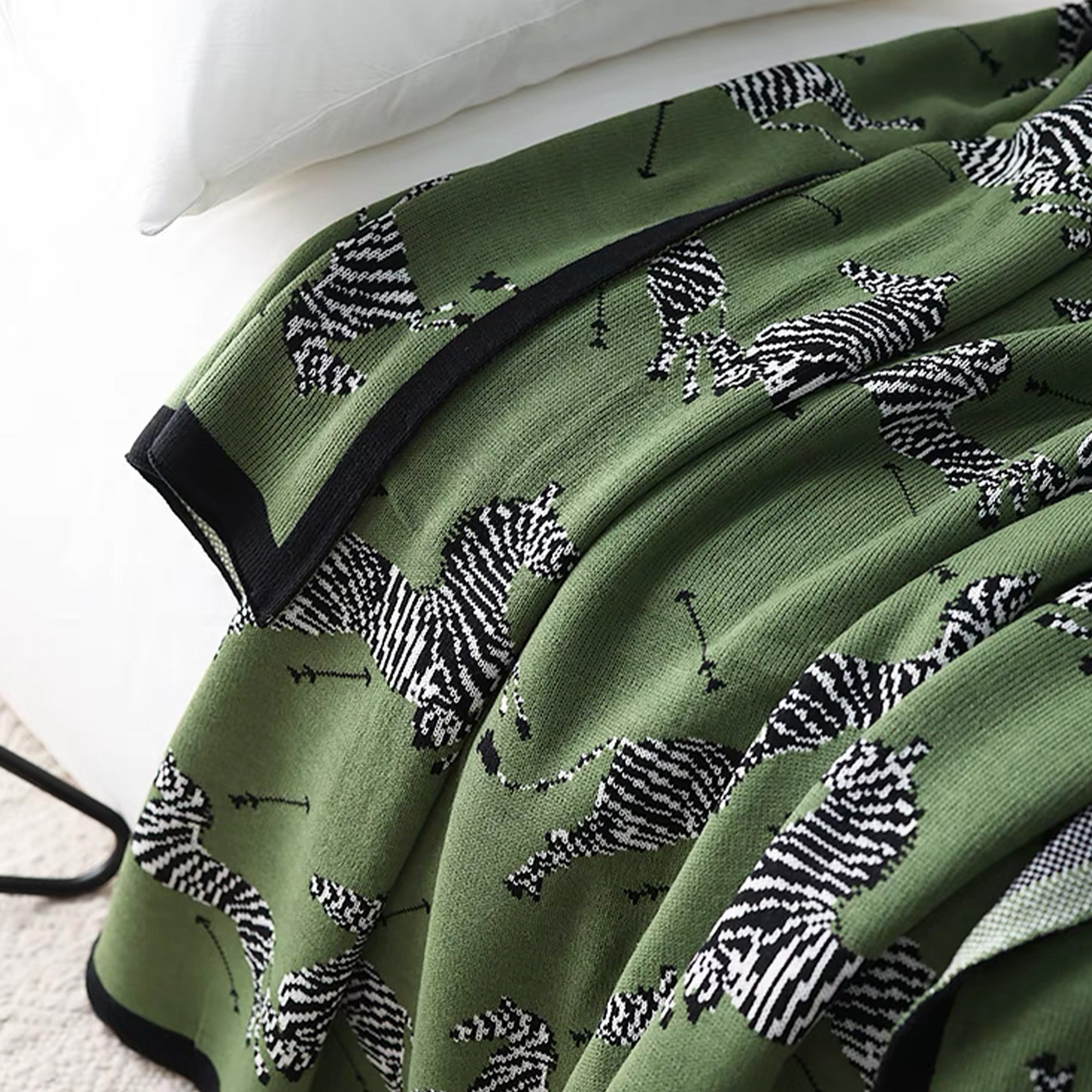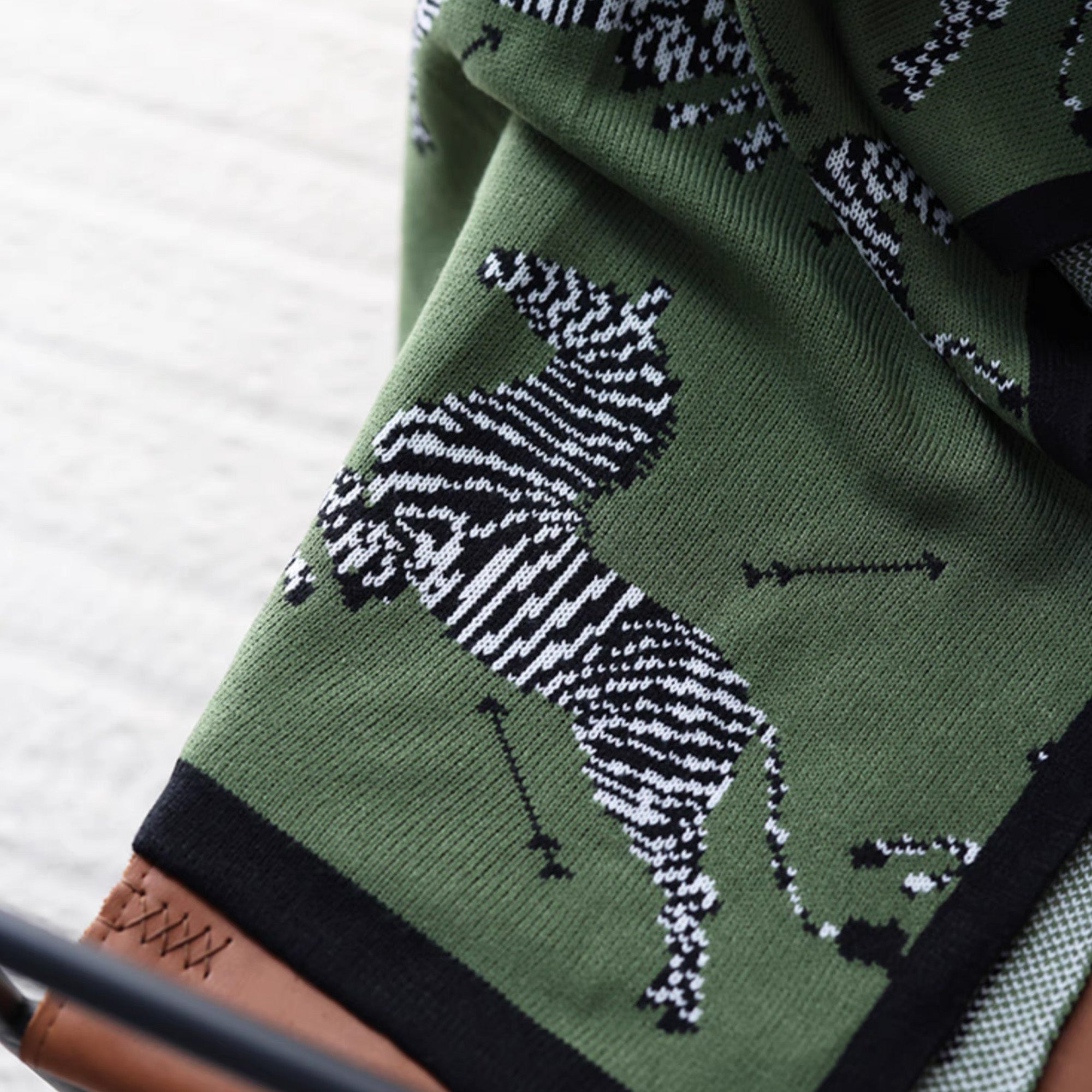 Wprowadź odrobinę dzikiej elegancji do swojego domu z naszym kocem Zebra Safari. Z zabawnym wzorem zebry na soczyście zielonym tle, ten narzut idealnie nada każdemu wnętrzu niepowtarzalny, awangardowy charakter. Miękka dzianina zapewnia ciepło i wygodę, a wyrazisty wzór sprawia, że będzie przyciągającym wzrok akcentem na kanapach, fotelach i łóżkach.