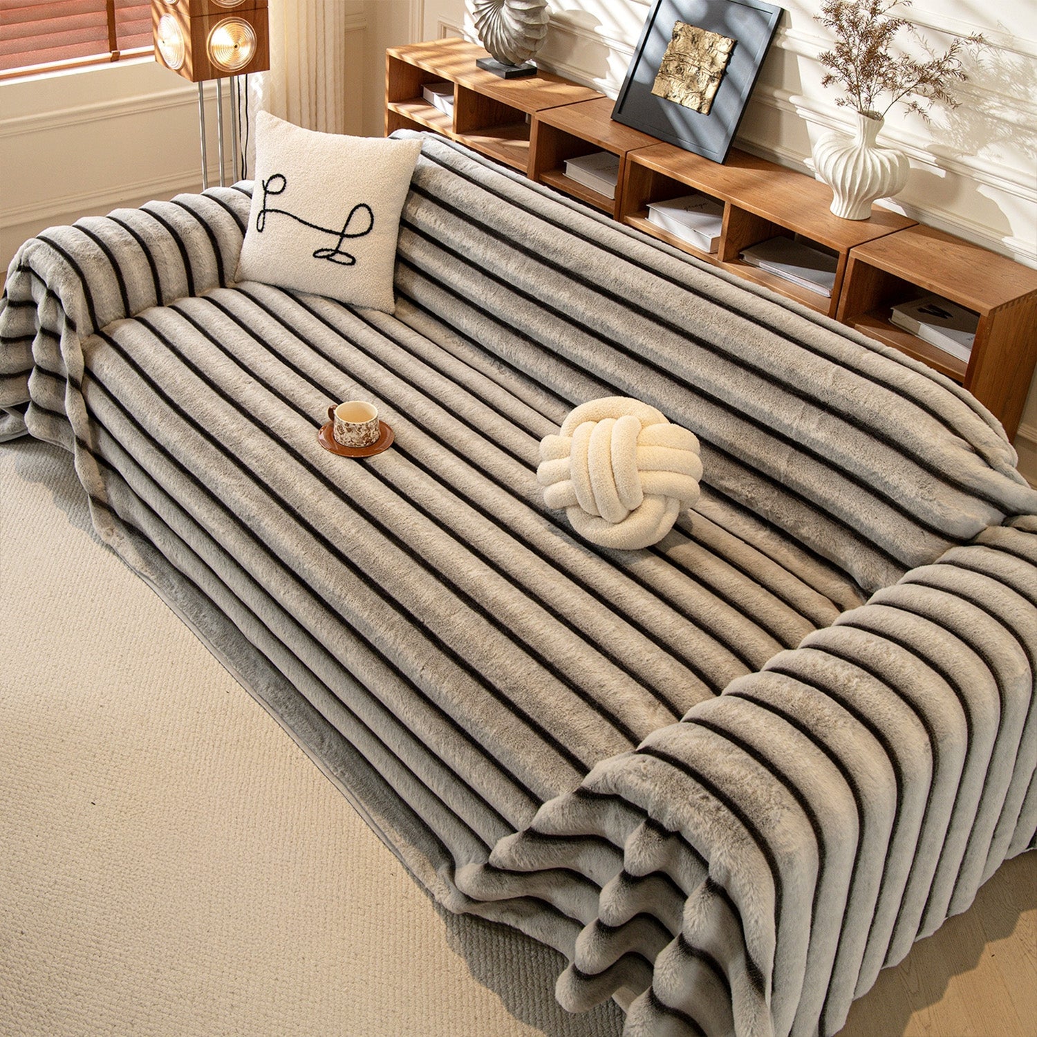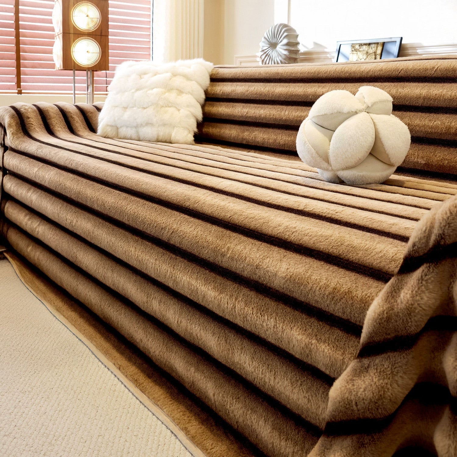 Bardzo duży luksusowy pokrowiec na sofę ze sztucznego futra w paski