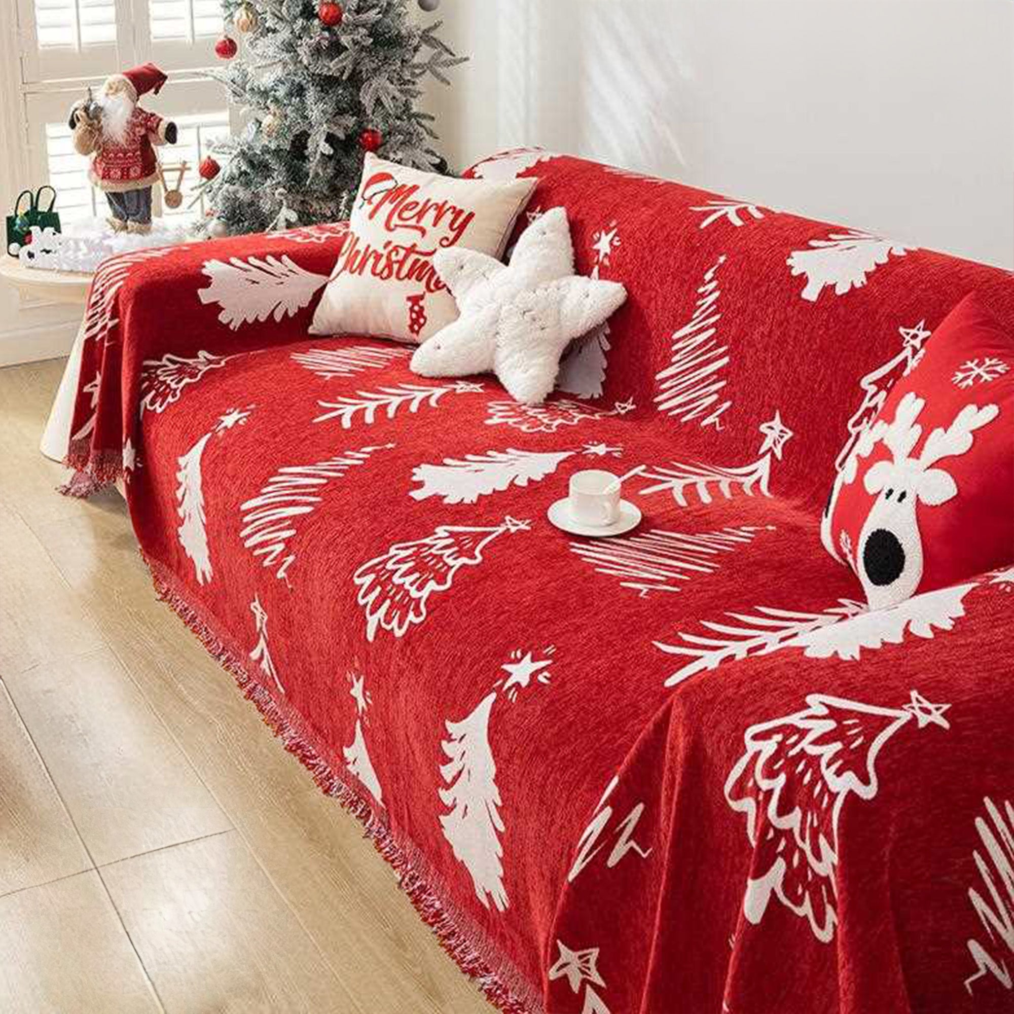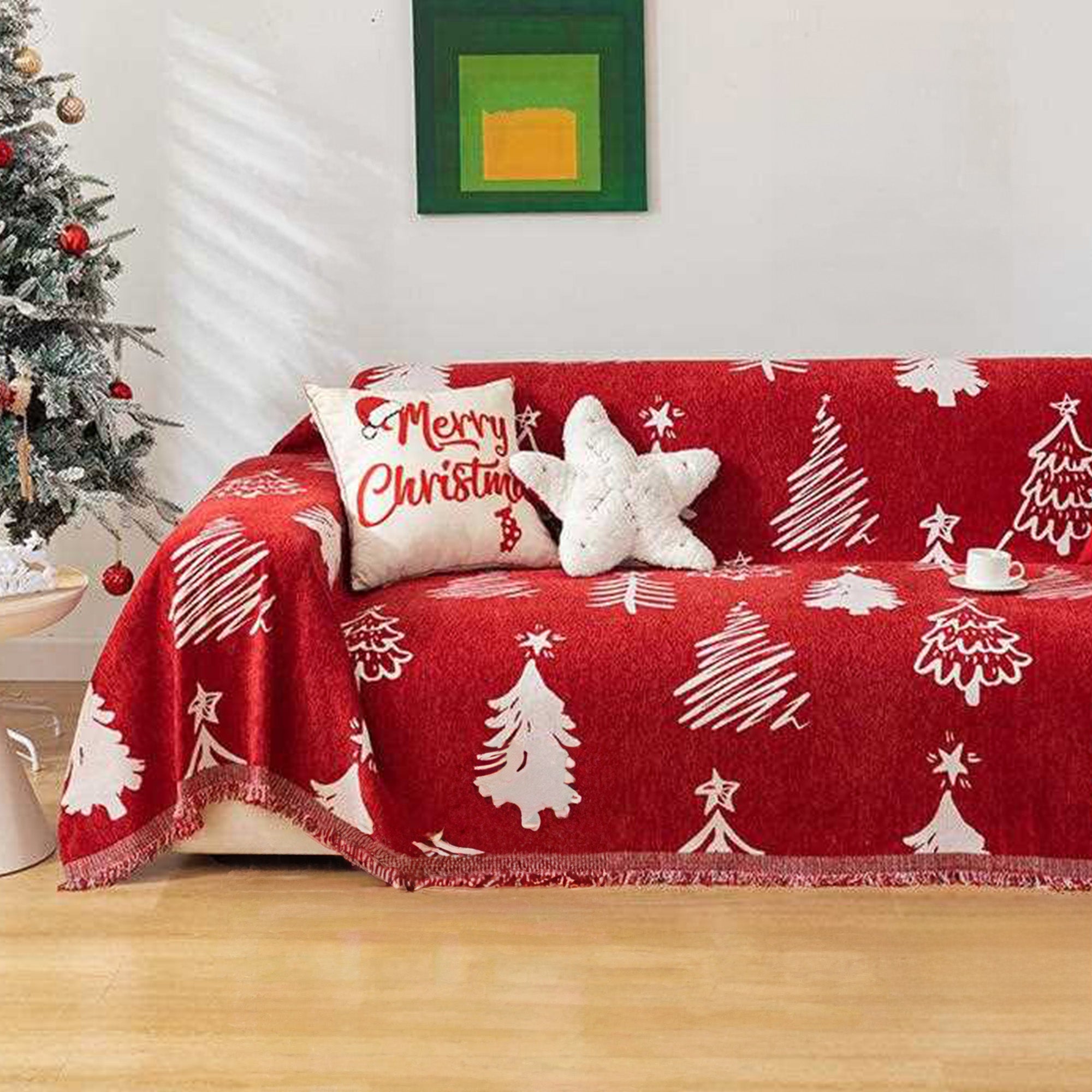 Wesoły świąteczny pokrowiec na sofę Chenille w kolorze czerwonym z motywem choinki i gwiazdek jako dekoracja świąteczna