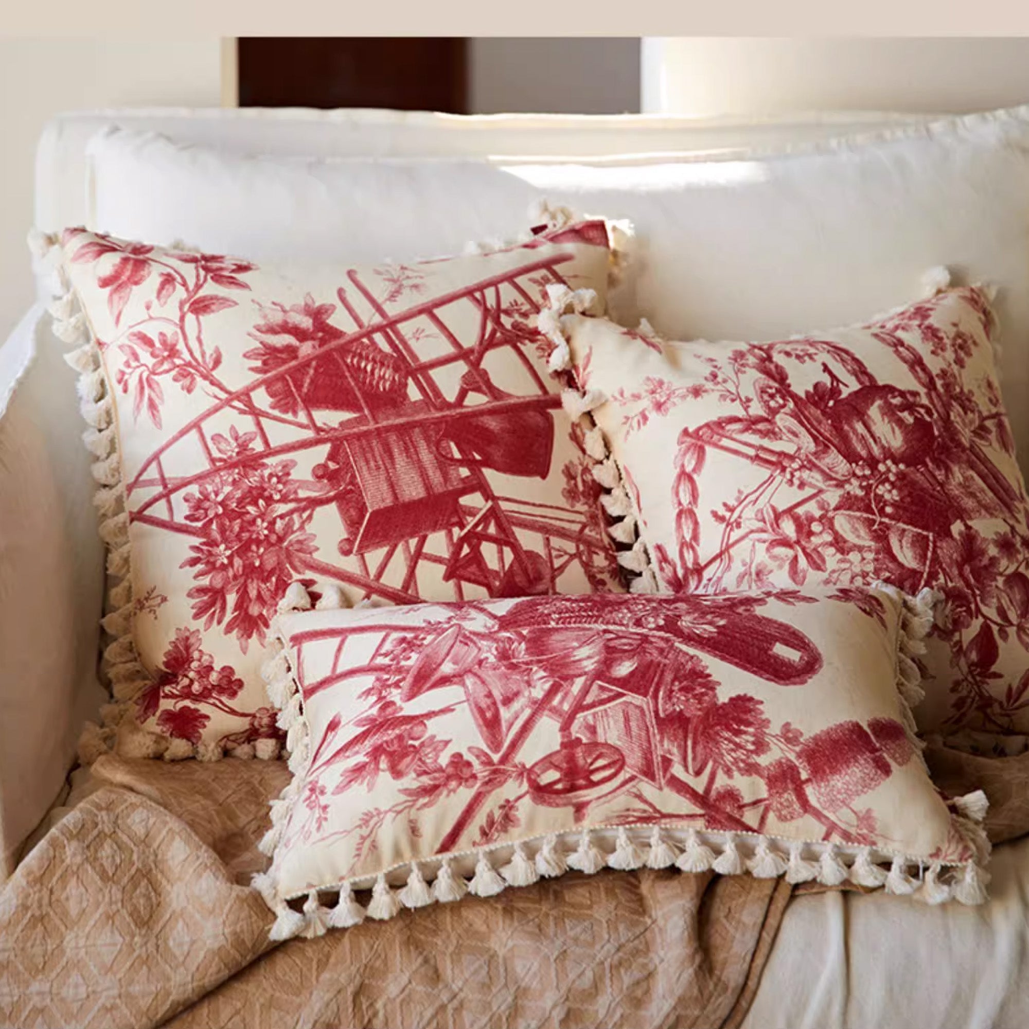 •Poduszka ozdobiona klasycznym czerwonym wzorem toile na kremowym tle przedstawia scenę z ogrodu w stylu vintage z drabinami, koszami i kwitnącą roślinnością.